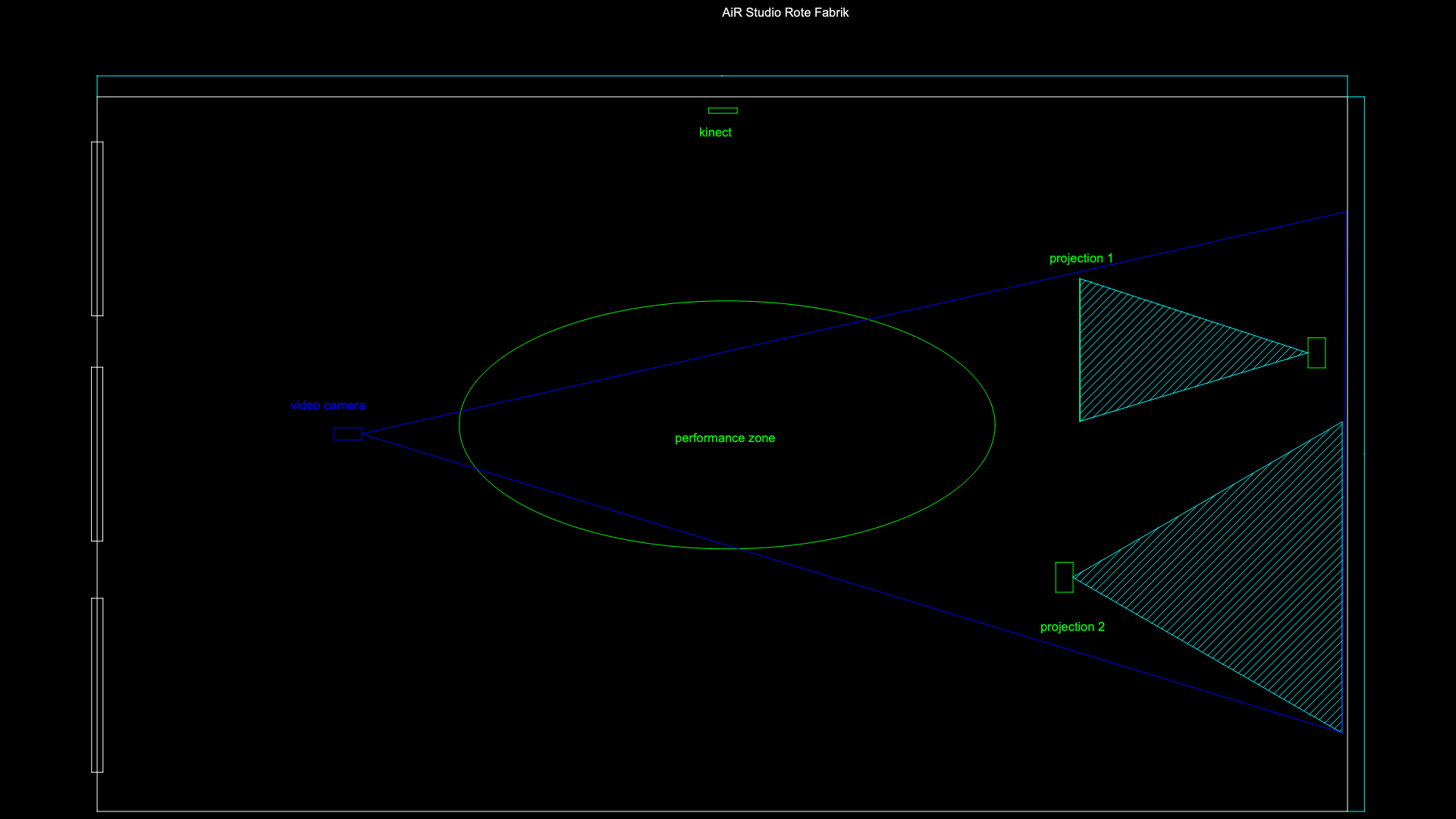 The base system consists of a performance space, 1 or more performers, a camera for live video feed, 1 Kinect sensor for motion tracking, a computer running Isadora and TouchDesigner for real time media generation and manipulation, 1 rear projection surface, 1 front projection surface (back-wall), 2 video projectors, theatre lighting system (3 spot lights), multi-channel audio system.